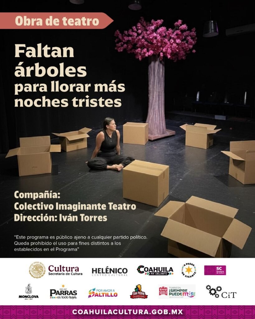 San Pedro, Coahuila.- El Gobierno Municipal, a través de la Dirección de Cultura, invita a la comunidad a disfrutar de la puesta en escena “Faltan árboles para llorar más noches tristes”, una obra dirigida por Iván Torres e interpretada por la compañía teatral Colectivo Imaginante Teatro.