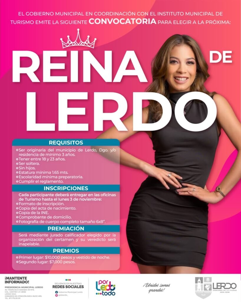 Lerdo, Durango.- El Gobierno Municipal de Lerdo en coordinación con el Instituto Municipal de Turismo emitió la convocatoria para elegir a la próxima Reina de Lerdo.