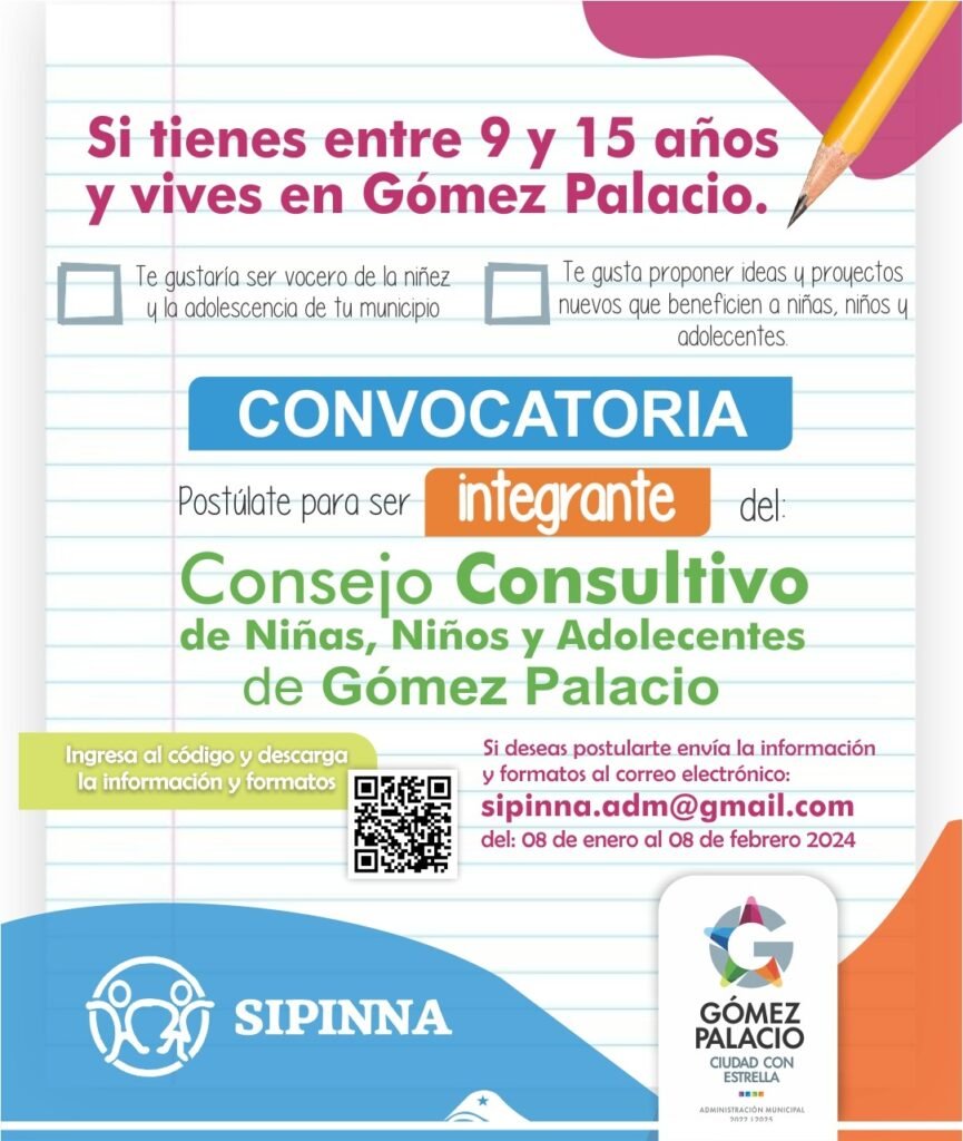 Gómez Palacio, Durango.- El Ayuntamiento de Gómez Palacio, a través de la Secretaría Ejecutiva del Sistema de Protección Integral de Niñas, Niños y Adolescentes (SIPINNA), convoca a las niñas, niños y adolescentes de 9 a 15 años, a postularse para ser integrante del Consejo Consultivo de Niñas, Niños y Adolescentes de Gómez Palacio.