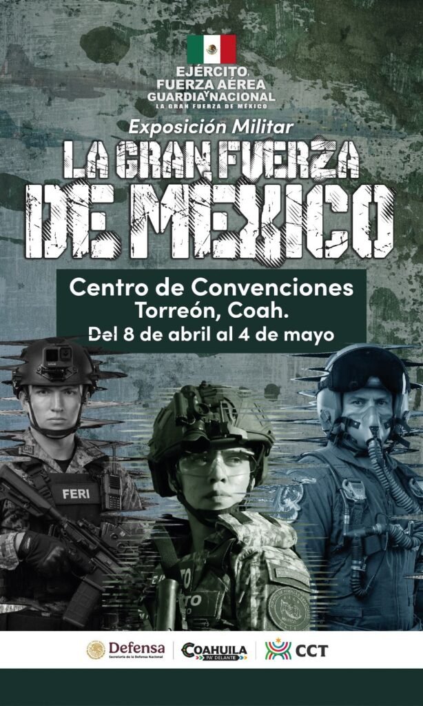 Torreón, Coahuila.- En un esfuerzo por fortalecer el vínculo entre la ciudadanía y las instituciones de seguridad, la Secretaría de la Defensa Nacional, en conjunto con el Gobierno del Estado de Coahuila y el Ayuntamiento de Torreón, anunciaron oficialmente la llegada de la exposición militar “La Gran Fuerza de México”, magno evento que se desarrollará en las instalaciones del Centro de Convenciones de Torreón del 8 de abril al 4 de mayo, con un horario de 09:00 a 18:00 horas y acceso totalmente gratuito.