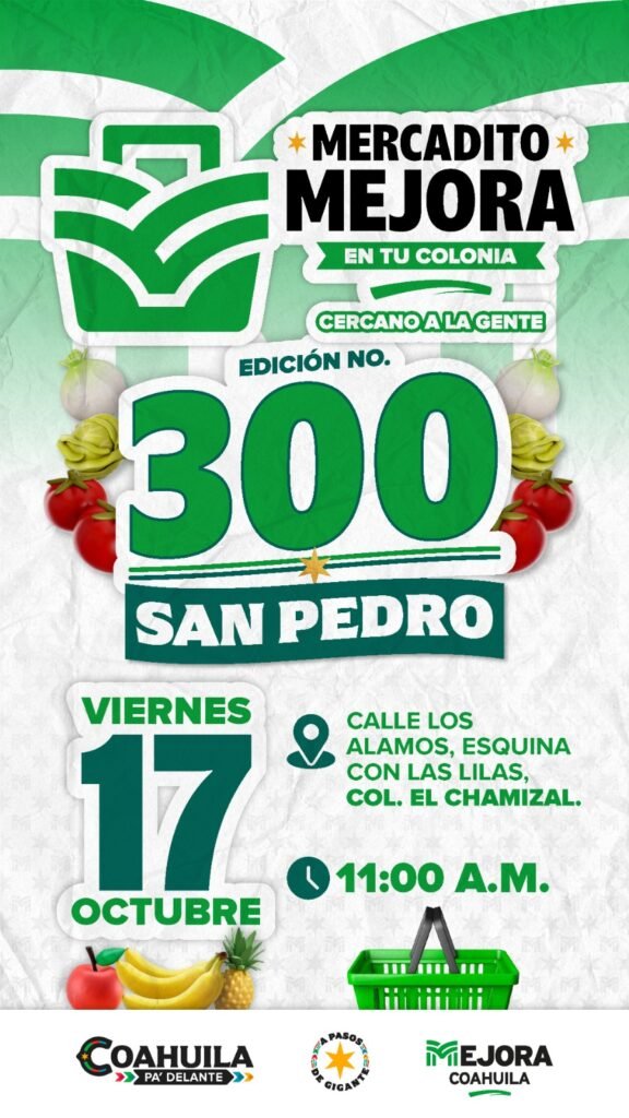 San Pedro, Coahuila.- Con el objetivo de apoyar la economía familiar y acercar productos de la canasta básica a bajo costo, el Gobierno del Estado de Coahuila, en coordinación con el Gobierno Municipal, llevará a cabo este viernes 17 de octubre el programa Mercadito Mejora”, en la techumbre de la colonia El Chamizal.