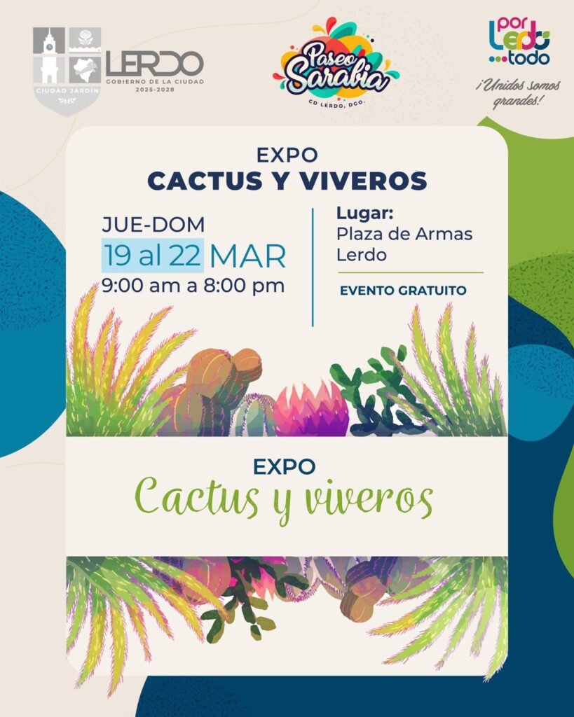 Lerdo, Durango.- El Gobierno Municipal de Lerdo, a través de la Dirección de Arte y Cultura invita a los amantes de la naturaleza y las plantitas para acudir este fin de semana a la ‘Expo Cactus y Viveros’ que se desarrollará en la Plaza de Armas de Ciudad Lerdo.