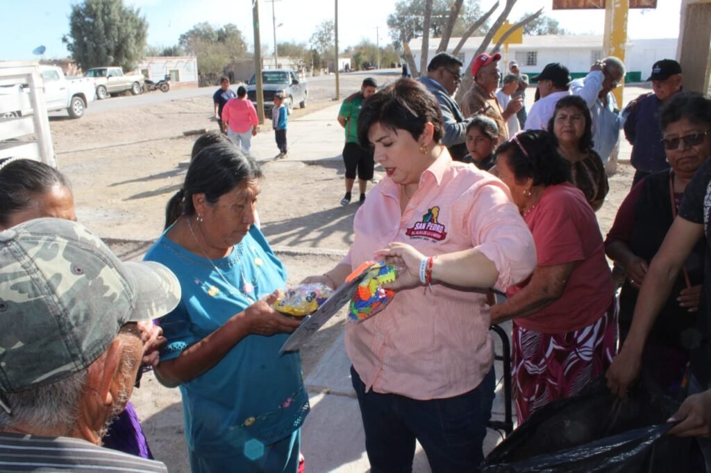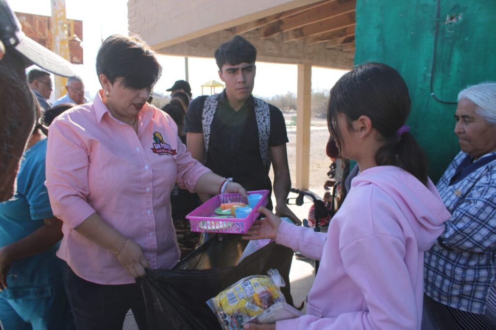Durante la visita, la presidenta municipal convivió con las familias del ejido y realizó la entrega de bolos y juguetes a las niñas y los niños, quienes disfrutaron de un momento de alegría y convivencia.