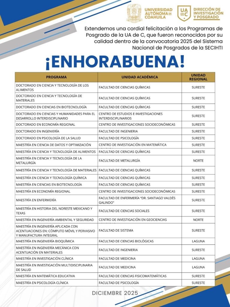 Saltillo, Coahuila.- La Universidad Autónoma de Coahuila participó exitosamente dentro de la Convocatoria 2025 del Sistema Nacional de Posgrados de la Secretaría de Ciencia, Humanidades, Tecnología e Innovación (SECIHTI), registrando 27 programas de los cuales 24 fueron reconocidos por su calidad, lo que marca un hecho histórico para la institución.