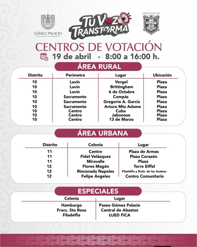 En la zona urbana, los centros de votación del programa “Tu Voz Transforma” estarán ubicados en la Plaza de Armas del sector Centro, Plaza Corazón de Miravalle, la plaza del fraccionamiento Miravalle, la Torre Eiffel en la colonia Flores Magón, el Centro Comunitario de la colonia Felipe Ángeles y en el sector Filadelfia, específicamente en Filadelfia y Rinconada de las Azaleas.