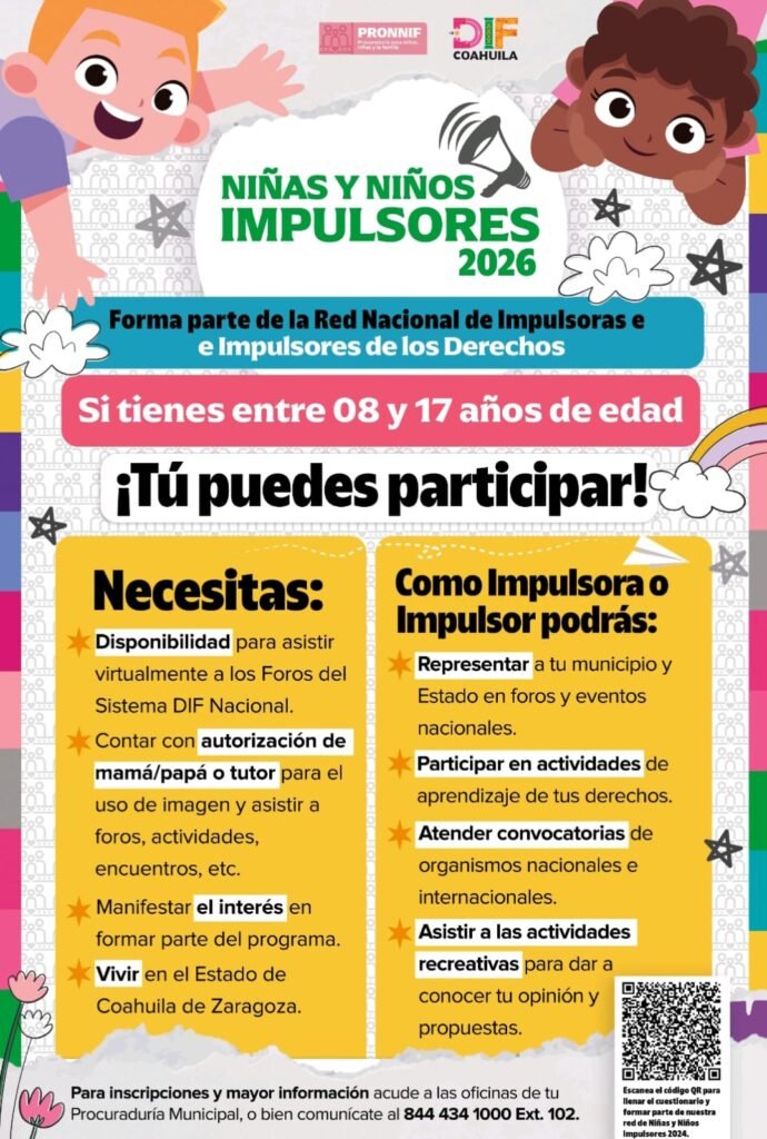 San Pedro, Coahuila.- El DIF Coahuila y PRONNIF estatal, a través de las PRONNIF municipales, lanzan la convocatoria para integrar la Red Nacional de Impulsoras e Impulsores de los Derechos de Niñas, Niños y Adolescentes, invitando a formar parte del programa “Niñas y Niños Impulsores 2026”.