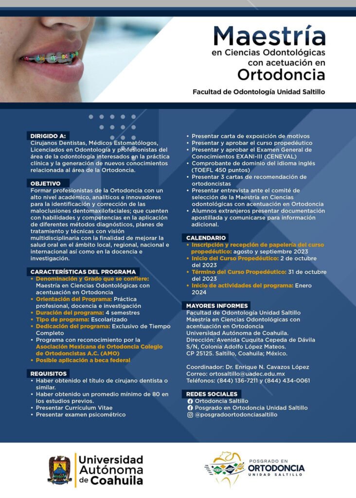 Para más información dirigirse con el coordinador del Posgrado Dr. Enrique Cavazos López al correo ortosaltillo@uadec.edu.mx, llamar a los teléfono (844) 136 7211 y (844) 434 00 61 o consultar la convocatoria que se encuentra publicada en las páginas de Facebook “Facultad de Odontología UAdeC Oficial”, “Ortodoncia Saltillo” o “Posgrado en Ortodoncia Unidad Saltillo”.