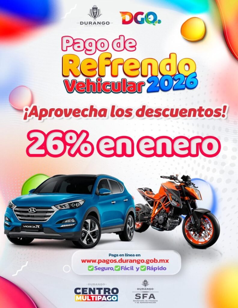 Durango, Durango.- El Gobierno de Durango, mantendrá durante enero un descuento mayor al de años anteriores, ahora del 26% en el refrendo vehicular 2026, como una medida de apoyo directo a la economía de las familias duranguenses, informó Eduardo Solís Nogueira, director de Recaudación.