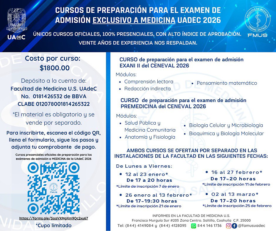 Saltillo, Coahuila.- La Facultad de Medicina Unidad Sureste de la Universidad Autónoma de Coahuila invita a las y los aspirantes a la Licenciatura en Médico Cirujano a participar en el Curso de Preparación para el Examen de Admisión para el ciclo agosto-diciembre 2026.