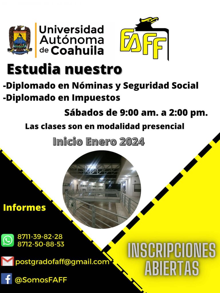 Torreón, Coahuila.- La Facultad de Administración Fiscal y Financiera Unidad Torreón de la Universidad Autónoma de Coahuila, invita a profesionales y estudiantes a cursar los Diplomados Especializados en Nómina y Seguridad Social y en Impuestos, ambos inician el 27 de enero de 2024.