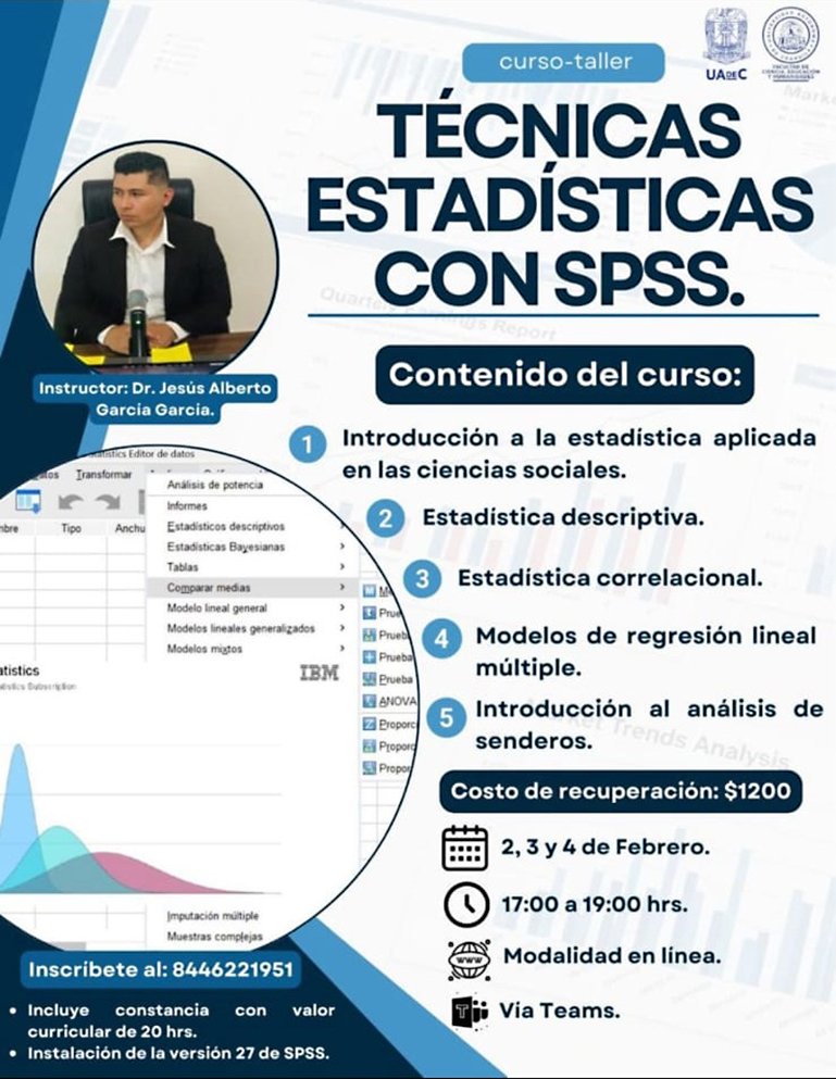 El contenido académico incluye la Introducción a la estadística aplicada a las ciencias sociales, Estadística descriptiva y correlacional, Modelos de regresión lineal múltiple e Introducción al análisis de senderos; el curso estará a cargo del Dr. Jesús Alberto García García.