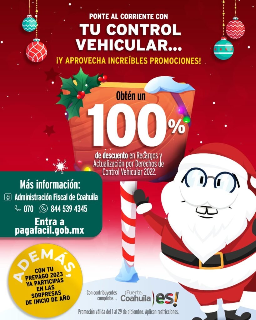“Este es el momento para ponerse al corriente y poder disfrutar de las múltiples promociones vigentes. A los cumplidos, Coahuila sí los premia. Tienen hasta el 29 de diciembre del presente año para realizar su trámite y poder iniciar el próximo año al corriente en sus derechos de control vehicular”.