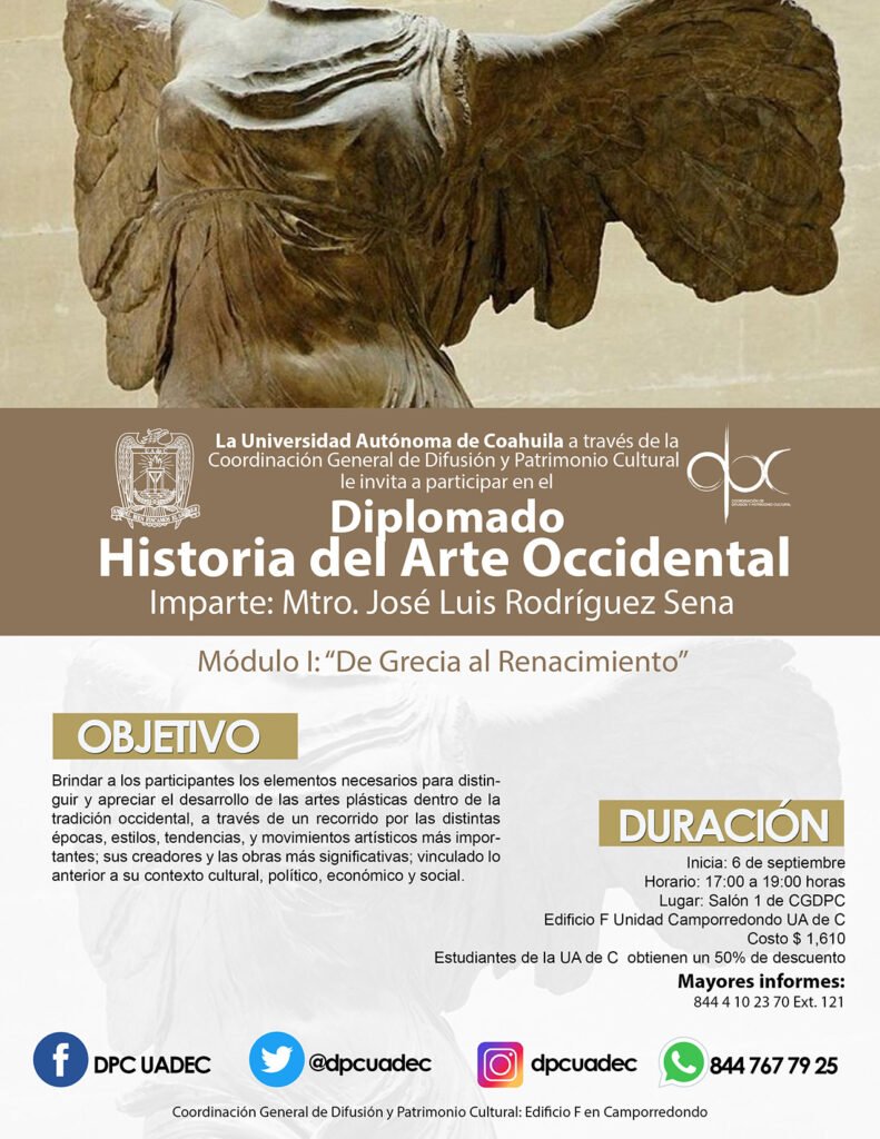 El 6 de septiembre inicia el diplomado “Historia del Arte Occidental, Módulo 1: De Grecia al Renacimiento”, con el que se brindará a los participantes los elementos necesarios para distinguir y apreciar el desarrollo de las artes plásticas dentro de la tradición occidental, a través de un recorrido por las distintas épocas, estilos, tendencias, y movimientos artísticos más importantes.
