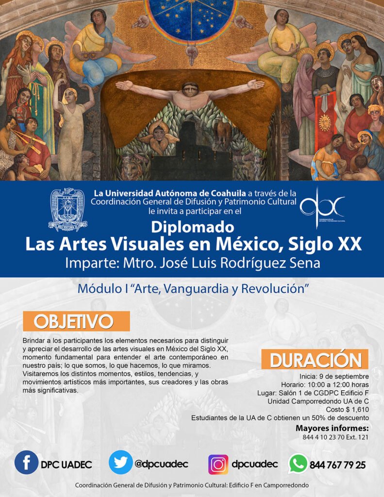 El 9 de septiembre iniciará el Diplomado “Las artes visuales en México, siglo XX, Módulo 1: Arte, vanguardia y revolución, a cargo del Mtro. José Luis Rodríguez Sena, se impartirá de 10:00 a 12:00 horas en el Salón 1 de la Coordinación General de Difusión y Patrimonio Cultural edificio “F” en Unidad Camporredondo, el costo es de $1,600.00 pesos.