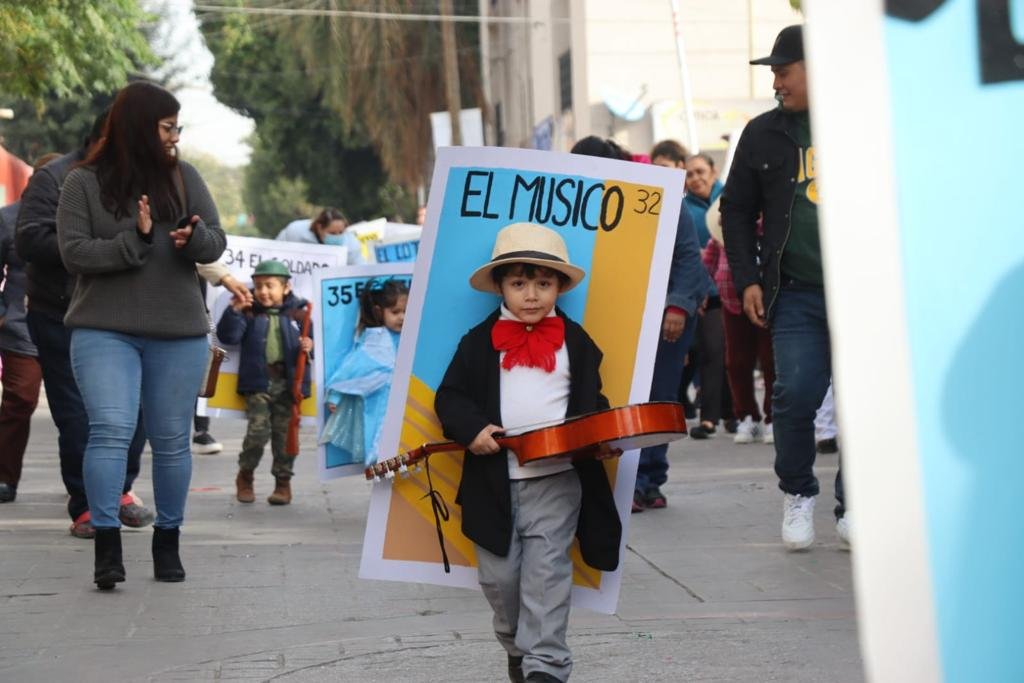 Los pequeños recorrieron el Paseo Sarabia desde el parque Victoria caracterizados de revolucionarios, personajes de la lotería, calaveritas y catrinas, con bailables, cantos, tablas rítmicas, demostraciones de taekwondo, activación física, actividades con la temática del cuidado del agua, banda de guerra y escolta.
