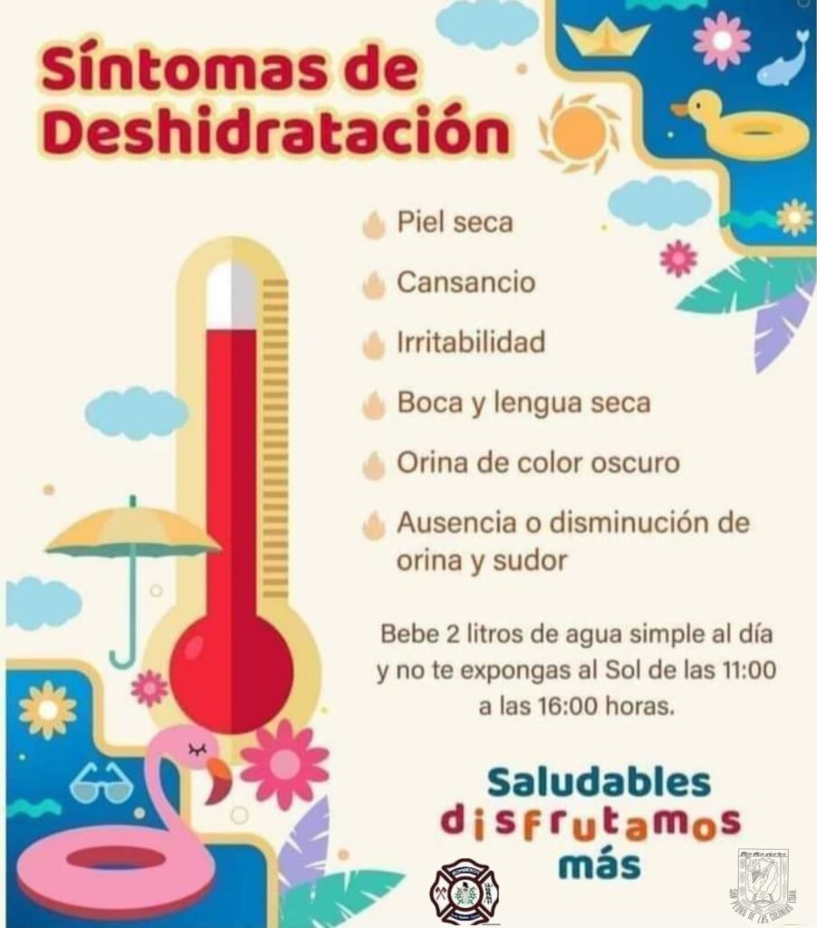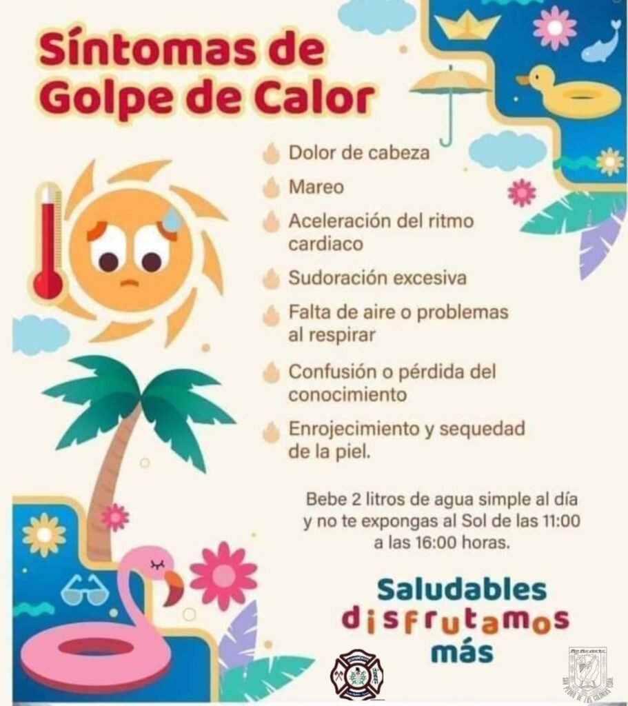 Por instrucciones del Alcalde David Ruíz Mejía y por conducto de Darío Rubio Sifuentes encargado de la Unidad de Protección Civil y del Departamento de Bomberos Municipales al mando del Comandante Arnol García Niño; se recomienda a la población extremar precauciones ante posibles golpes de calor.