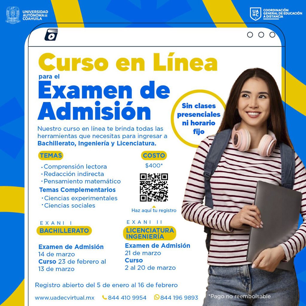 Saltillo, Coahuila.- La Universidad Autónoma de Coahuila a través de la Coordinación General de Educación a Distancia, convoca a los aspirantes a ingresar a bachillerato, licenciatura e ingeniería para el semestre agosto-diciembre 2026, a inscribirse al Curso de Preparación para el Examen de Admisión 100 por ciento en Línea.