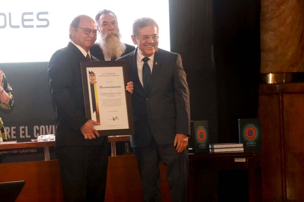 Al finalizar la ceremonia, el rector Salvador Hernández Vélez le entregó al Dr. Roberto Bernal un reconocimiento por su invaluable labor y contribución durante la pandemia y este a su vez entregó a la UAdeC y a la Universidad de Durango un acervo bibliográfico.