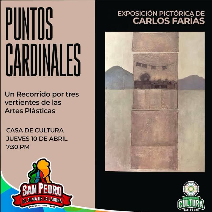 El jueves 10 de abril, el público podrá disfrutar de la exposición pictórica «Puntos Cardinales», de Carlos Farías, una muestra que ofrece un recorrido por tres vertientes de las artes plásticas. La inauguración de la exposición tendrá lugar en la Casa de la Cultura a las 7:30 de la tarde