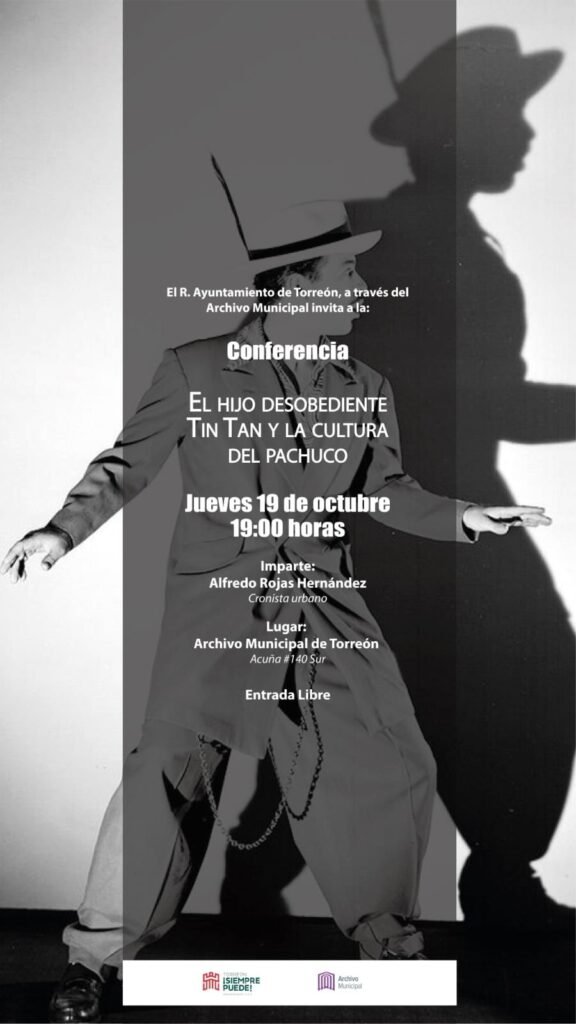 Torreón, Coahuila.- El Archivo Municipal de Torreón presentará la conferencia “El hijo desobediente, Tin Tan y la cultura del pachuco”, a cargo del cronista urbano Alfredo Rojas Hernández, el próximo jueves 19 de octubre a las 19:00 horas.