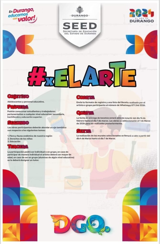 El subsecretario de Educación de la región Laguna, Fernando Ulises Adame de León, manifestó que «X el Arte» es una convocatoria de pintura que estará vigente a partir de la fecha, hasta el próximo viernes 1 de marzo de este año, y los jóvenes que deseen participar deberán elegir su tema entre los tres ejes temáticos: Flora y fauna endémica en la región, Derechos de los niños y educación.