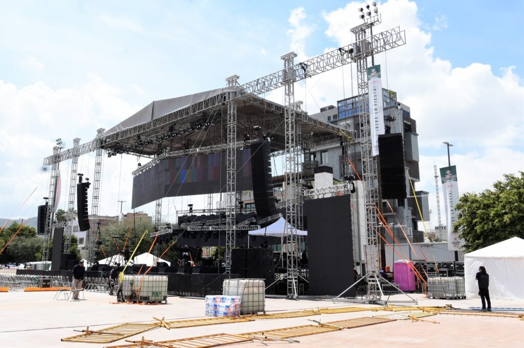 Torreón, Coahuila.- Previo al inicio de los festejos de las Fiestas Patrias en Torreón, personal de la Dirección de Protección Civil y Bomberos, realiza la revisión de las estructuras donde se montó el escenario que será utilizado durante esta noche, en la celebración del Grito de Independencia y el 118 aniversario de la ciudad.