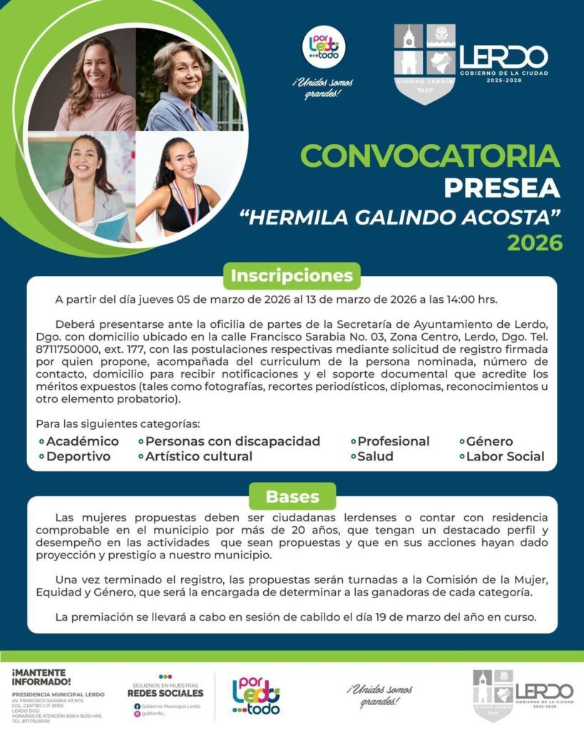 Lerdo, Durango.- El Gobierno Municipal de Lerdo invita a la ciudadanía, organizaciones sociales e instituciones de educación reconocidas en La Laguna, para proponer a mujeres que inspiran y dejan huella en el municipio, al Primer Premio Municipal de la Mujer Presea “Hermila Galindo Acosta” 2026.