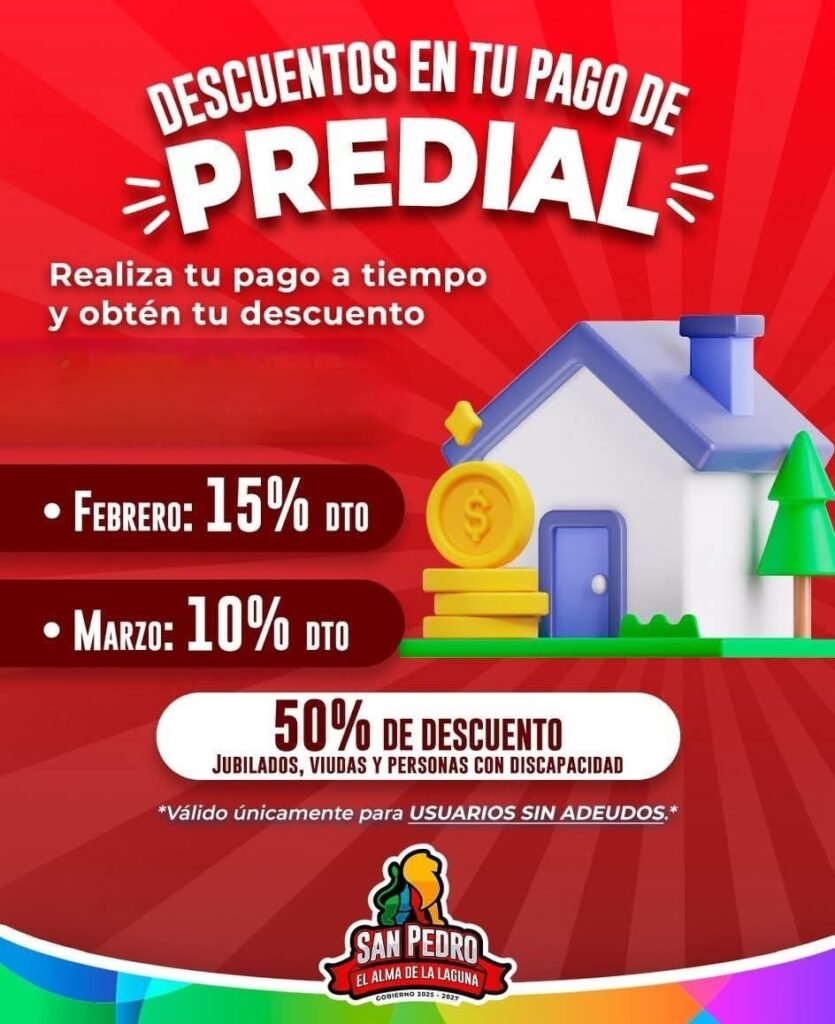 San Pedro, Coahuila.- El Gobierno Municipal invita a la población a aprovechar los últimos días del 15 por ciento de descuento en el pago del Impuesto Predial, pues esa promoción es únicamente por el mes de febrero y finaliza el viernes 27.