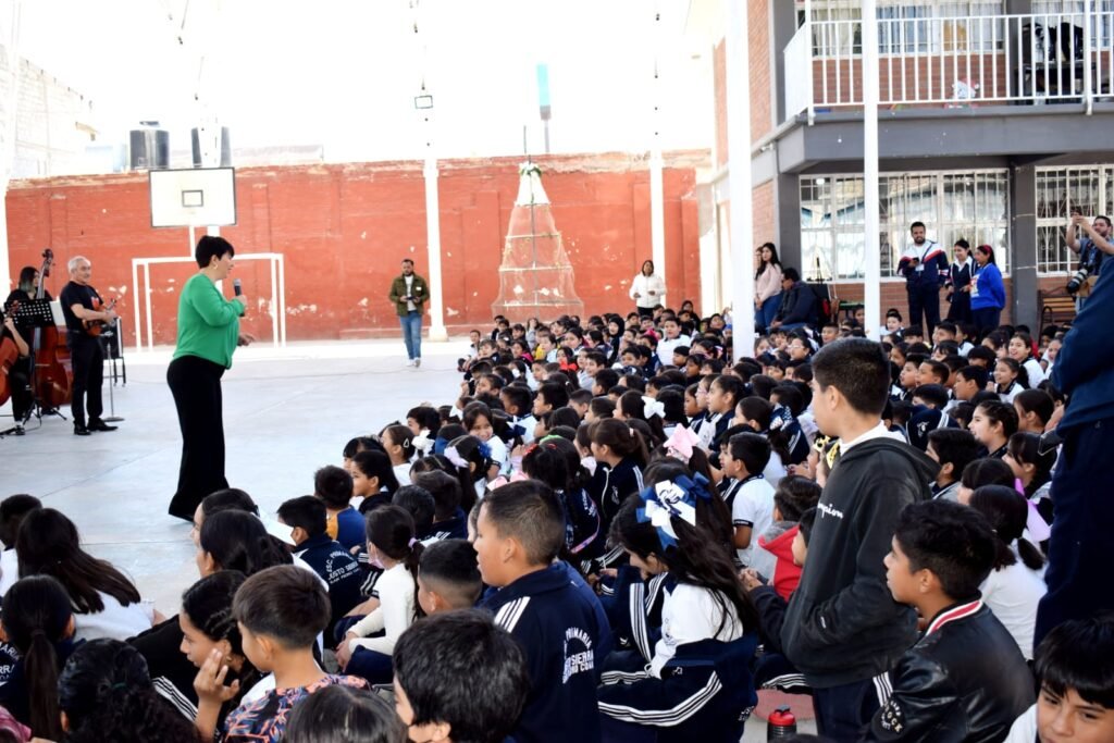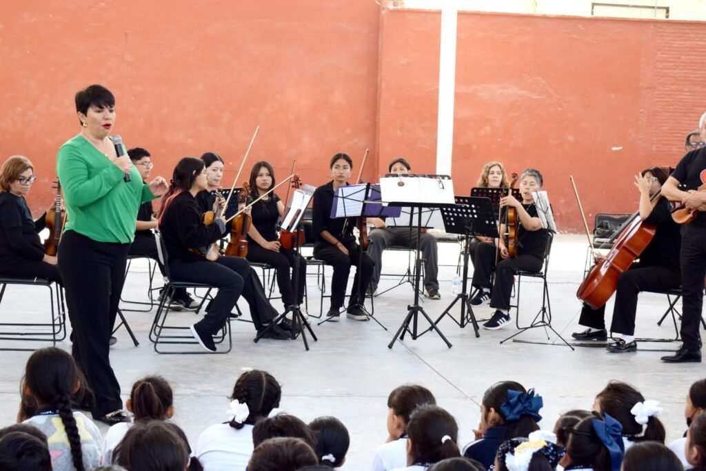 San Pedro, Coahuila.- La alcaldesa Brenda Cecilia Güereca Hernández asistió a una exhibición especial de la Orquesta de Cámara de San Pedro en la Escuela Primaria «Justo Sierra», donde niñas y niños tuvieron la oportunidad de conocer y disfrutar de esta expresión artística.