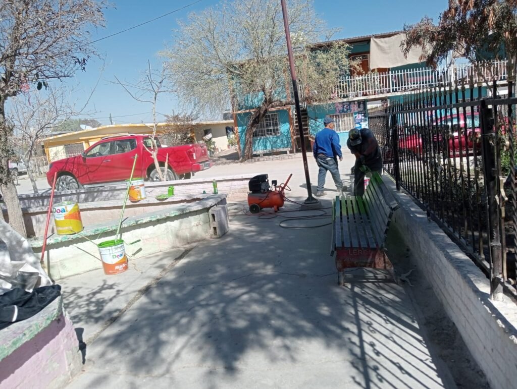 Lerdo, Durango.- La Dirección de Servicios Públicos de Lerdo llevó a cabo trabajos de mantenimiento en la plaza principal de la comunidad de Sapioriz, con labores de pintura, limpieza, poda y rehabilitación general, con el objetivo de mejorar este espacio para el disfrute de los habitantes.