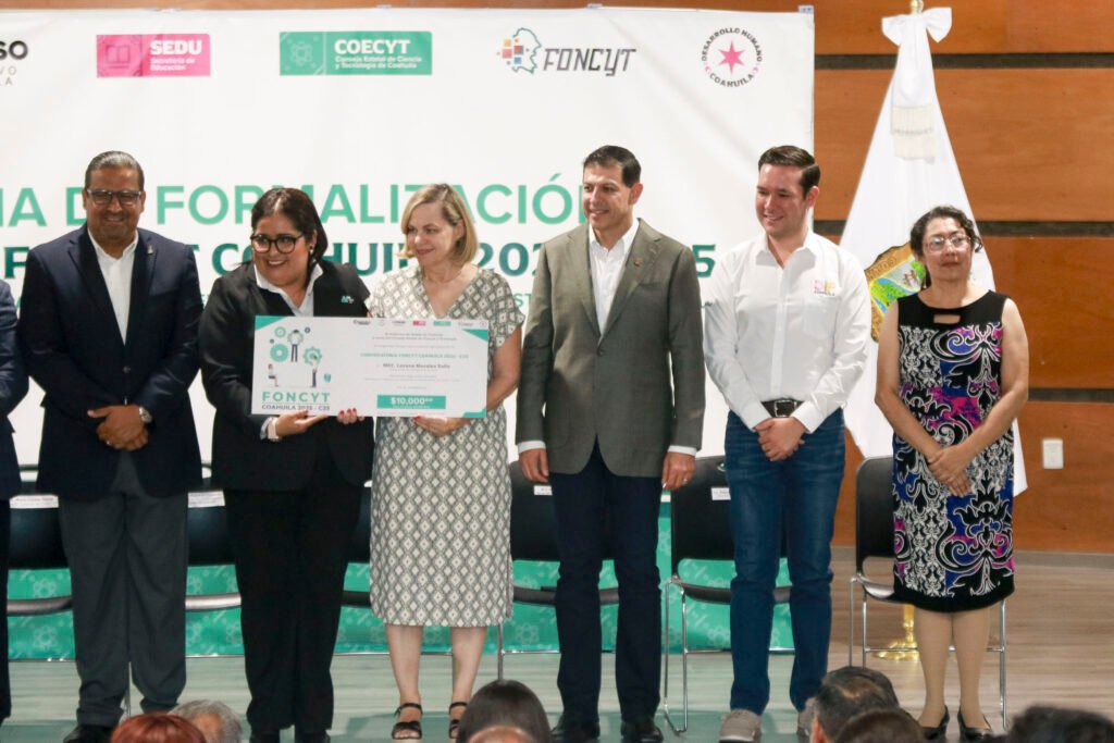 Durante la ceremonia se llevó a cabo la entrega simbólica de apoyo a 5 de los 90 proyectos aprobados para el Fondo Destinado a Promover el Desarrollo de la Ciencia y la Tecnología en el Estado de Coahuila (FONCYT).