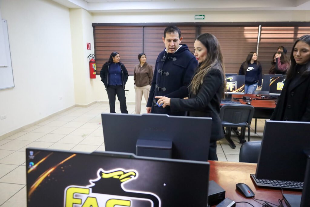 Acompañado por la directora Cristina Ordaz Moya y por la alumna Fernanda Moreno, inauguró el Centro de Cómputo de la FAFF, mediante la entrega de 20 equipos de cómputo y comentó que es su responsabilidad y labor apoyar a las y los directores, destinando recursos para el equipamiento que brinde una mejora en la realización de actividades de todos y cada uno de los estudiantes, ya que se busca la formación de mejores generaciones que el día de mañana transformen la sociedad
