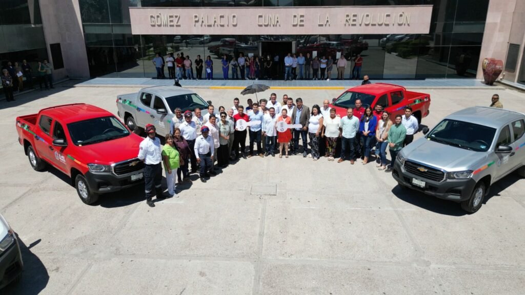 En la explanada de la Presidencia Municipal, la alcaldesa hizo entrega de las llaves de seis camionetas pick-up doble cabina, que a partir de hoy serán utilizadas en beneficio de los gomezpalatinos.