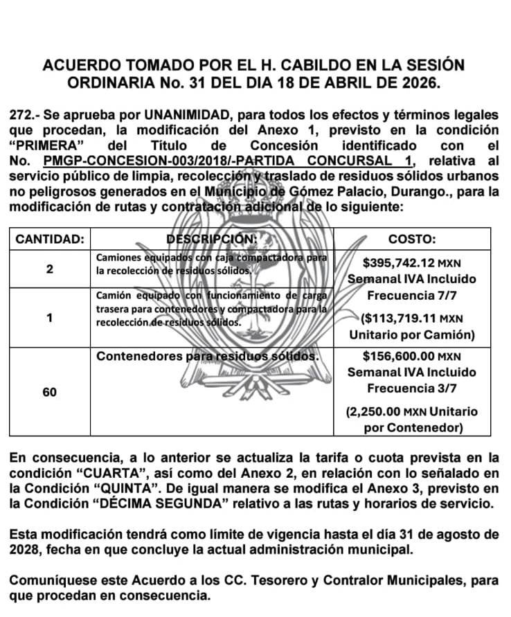 Gómez Palacio, Durango.- El Ayuntamiento de Gómez Palacio publicó este lunes en la Gaceta Municipal el anexo de la concesión de recolección de basura correspondiente al convenio con la empresa Círculo Recolector, el cual fue aprobado por el Cabildo el pasado 18 de abril.