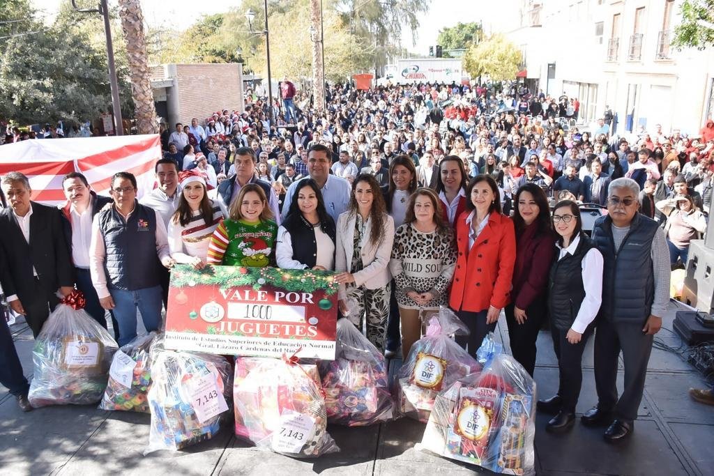 Lo anterior lo manifestó durante el evento organizado por el DIF Estatal “Juguetón 2022”, el cual tuvo lugar frente a la Plaza de Armas de la ciudad, donde la alcaldesa gomezpalatina acompañó a la presidenta honoraria del sistema estatal DIF y le hizo entrega de la donación de 1,500 juguetes por parte de la Presidencia Municipal, 500 juguetes del DIF Gómez Palacio y 13 mil 800 aportados por la empresa Chilchota Alimentos.