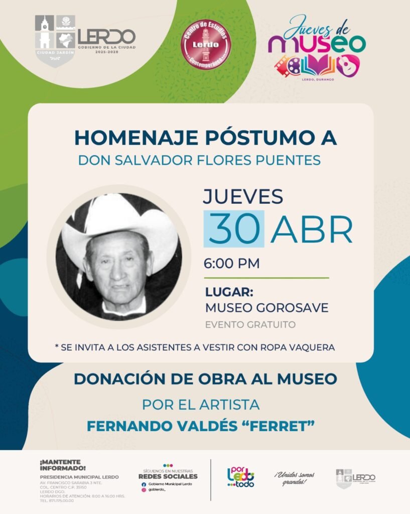 Lerdo, Durango.- Con el propósito de preservar la memoria histórica de quienes han dejado una huella imborrable en el municipio, el Gobierno de Lerdo, a través de la Dirección de Museografía, invita a la ciudadanía al homenaje en honor a Don Salvador Flores Puentes, destacado personaje lerdense y pionero del rodeo en la región.