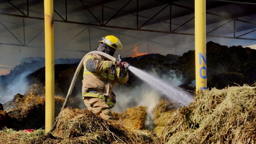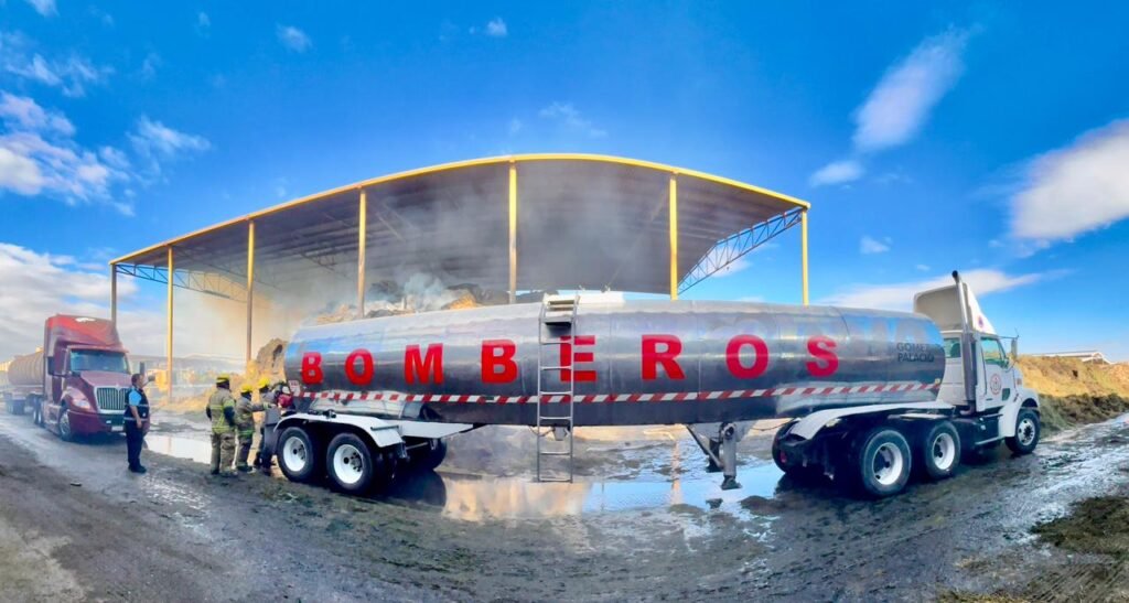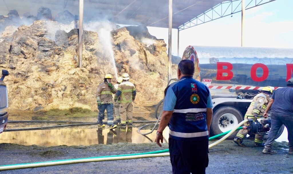 A las tareas para controlar y apagar el fuego que se extendió a dos naves de almacenamiento, con una capacidad aproximada a 8 mil atados de forraje, se desplazó de manera inicial a una decena de elementos de bomberos gomezpalatinos que operan la unidad cisterna número 15 con capacidad de 35 mil litros y la unidad extintora 1184.