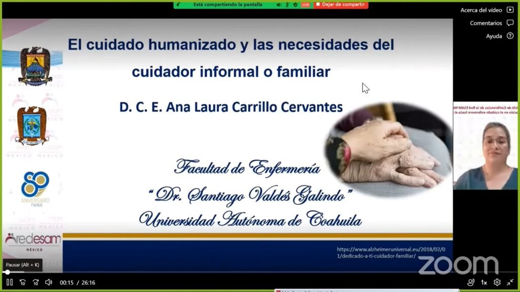 Saltillo, Coahuila.- La Facultad de Enfermería “Dr. Santiago Valdés Galindo” Unidad Saltillo de la Universidad Autónoma de Coahuila en conjunto con la Red Internacional de Enfermería en Salud del Adulto Mayor, llevaron a cabo el Ciclo de Videoconferencias “La humanización en el cuidado enfermero hacía el adulto mayor”, en el marco del Día Nacional del Adulto Mayor que se conmemora el 28 de agosto.