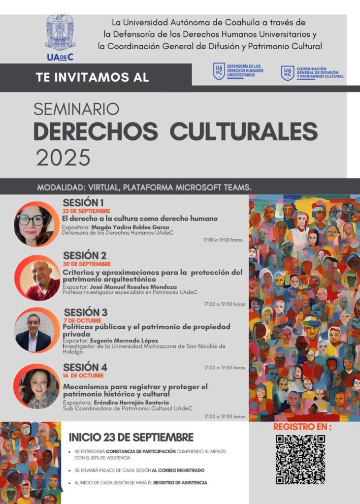 Saltillo, Coahuila.- La Universidad Autónoma de Coahuila a través de la Defensoría de Derechos Humanos Universitarios y la Coordinación General de Difusión y Patrimonio Cultural, invita al Seminario “Derechos Culturales 2025”, que se llevará a cabo del 23 de septiembre al 14 de octubre.