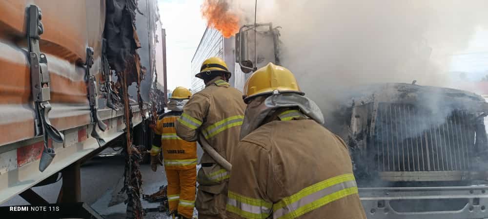 Las pérdidas de la cabina y motor, fueron totales, afectando también el fuego, la caja del lado izquierdo marca kenworth color naranja con placas 04-AC-2Z modelo 2022, trasporte Monterrey tripulado, por Ernesto Osvaldo Sida Rentería.