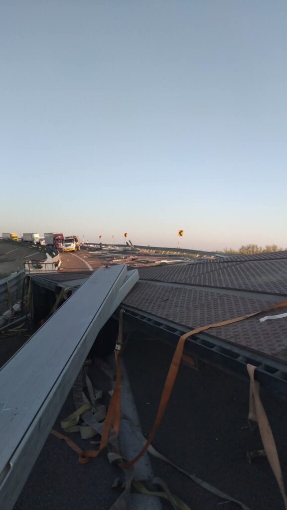 El neumático delantero se dañó, lo que provocó que perdiera el control en la curva y lo venciera la carga que llevaba en la caja, que eran polines de acero, por lo que terminó sobre su costado derecho.
