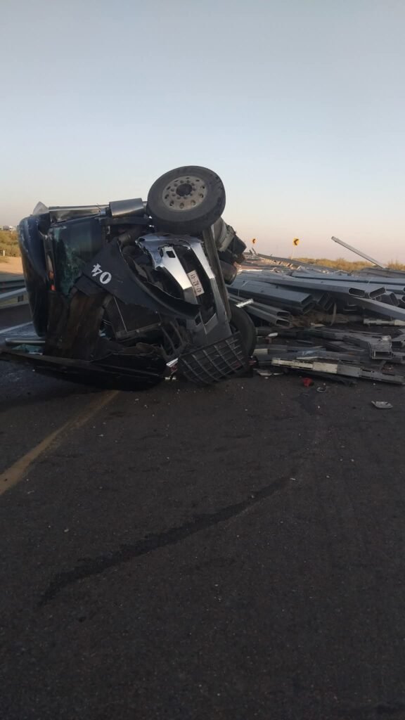 Matamoros, Coahuila.- Se registró la volcadura de un trailer en el Libramiento Norte Laguna, a la altura del kilómetro 30+900, en la entrada del municipio de Matamoros, el saldo fue 4 personas lesionadas y daños materiales.