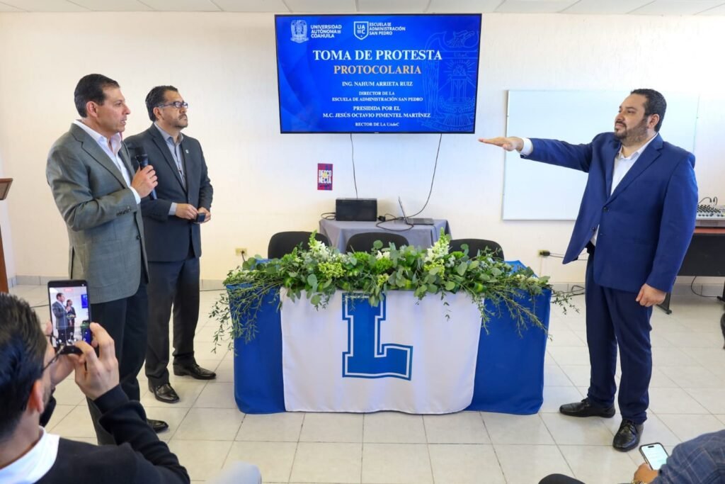 San Pedro, Coahuila.- El rector de la Universidad Autónoma de Coahuila, Octavio Pimentel Martínez, tomó protesta al Ing. Nahum Arrieta Ruiz como director de la Escuela de Administración San Pedro de la Unidad Laguna, para el periodo 2026-2029.
