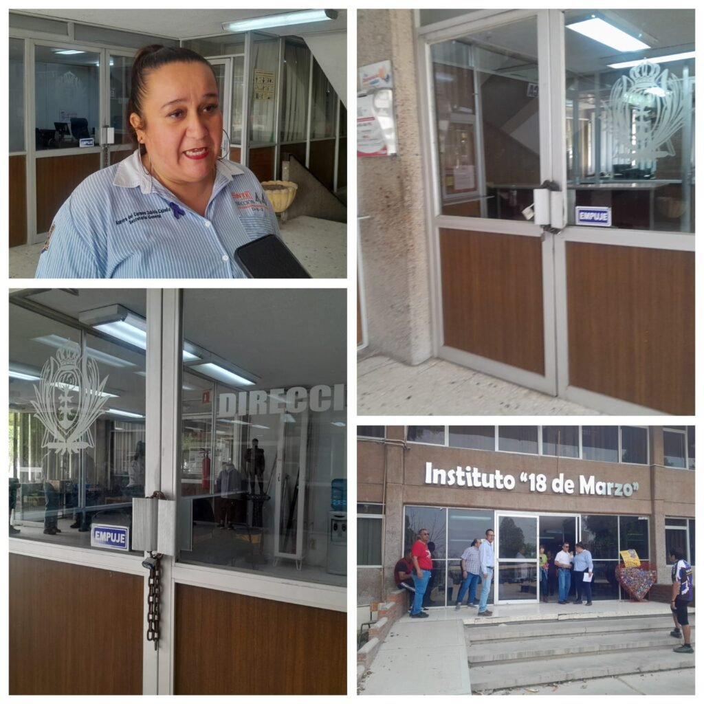 Gómez Palacio, Durango.- Trabajadores sindicalizados del Instituto 18 de Marzo realizaron la toma de oficinas del plantel la mañana de este lunes, en protesta por la falta de pago a profesores que cubrieron horas clase durante interinatos por motivos de salud.