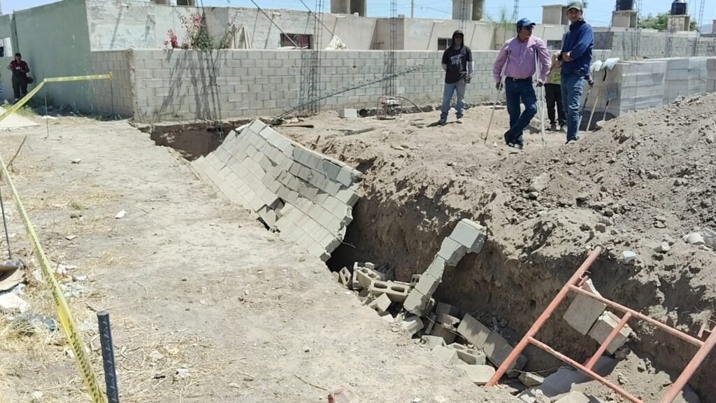 Francisco I. Madero, Coahuila.- Tres trabajadores resultaron lesionados tras derrumbarse una barda de block de 60 metros de longitud en el Fraccionamiento San Alberto, de Francisco I Madero, Coahuila.