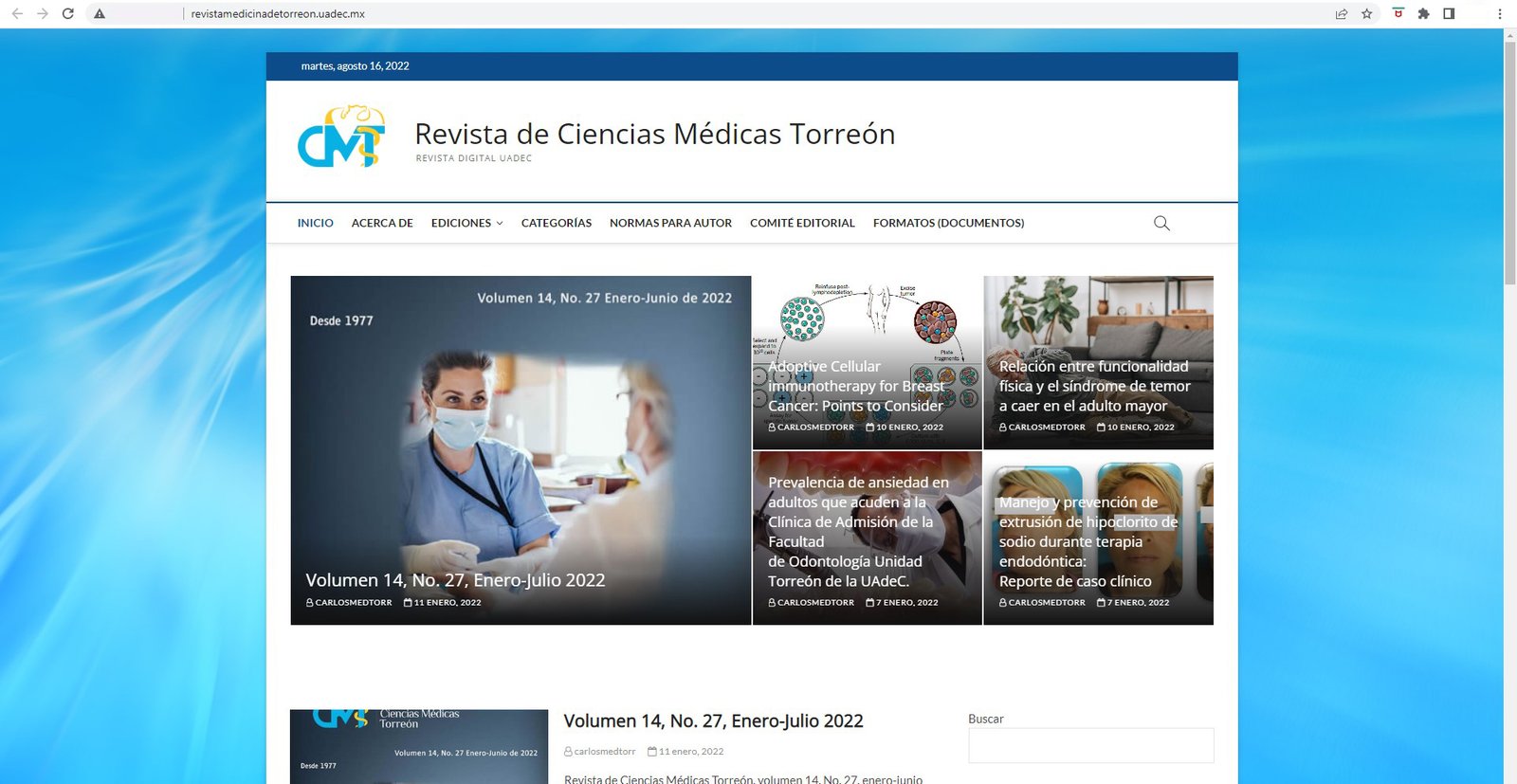 Torreón, Coahuila.- La Revista de Ciencias Médicas de la Facultad de Medicina Torreón y en coordinación con la Dirección de Investigación y Posgrado de la Universidad Autónoma de Coahuila, anuncia que ya cuenta con la edición digital y la página web http://www.revistamedicinadetorreon.uadec.mx/ en donde podrán acceder al volumen 14 edición No. 27 (enero-junio 2022).