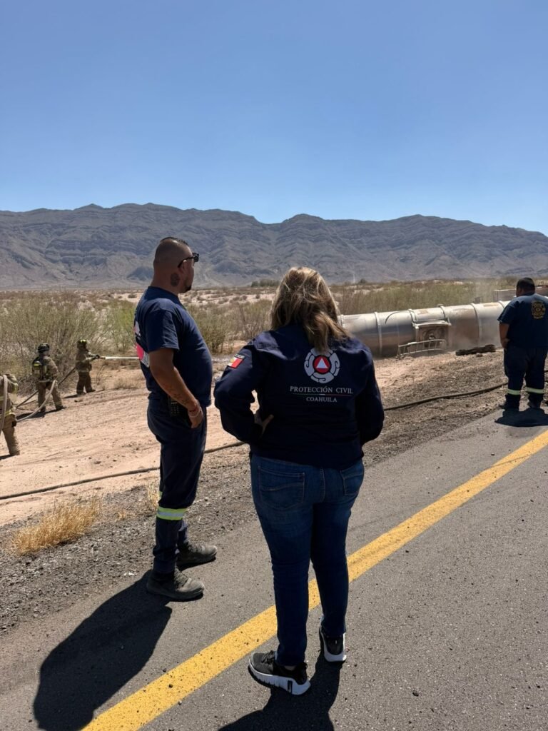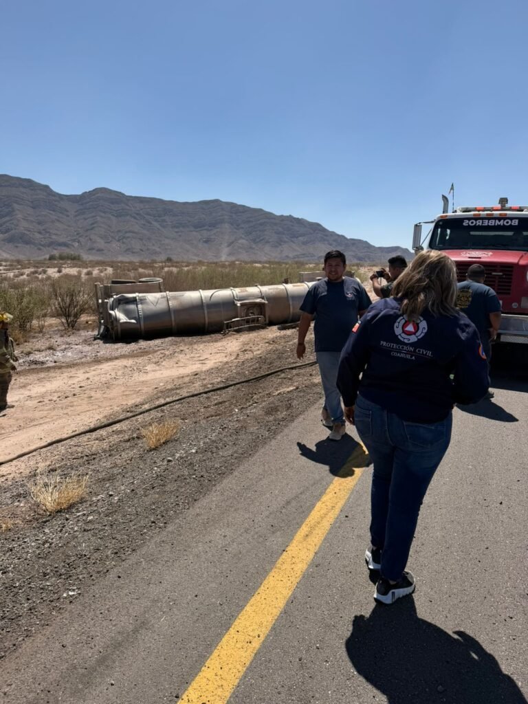 Torreón, Coahuila.- Alrededor de las 13:52 horas de este viernes se reportó la volcadura de un remolque contenedor que transportaba gasolina sobre la Carretera Saltillo – Matamoros, a 3 kilómetros de la caseta de La Cuchilla.